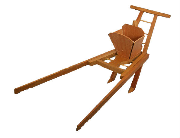 耧车一般有三条腿,三条腿上半部分是实心的,上端与横木扶手相连;下半部分是空心的,下端分别套着铁质“耧铧子”,用来破土开墒。耧车中间部位有一个“U”型开口朝上的木质盒子,是盛放种子的容器;盒子后下方有扁方孔,通过一个调节竹片与三条中空的耧腿相连,种子便可顺着耧腿播进田地里。耧车两边有两根两米多长的笔直木辕,用来驾驭耧车。